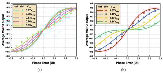 Figure 8 presents the comparison between calculated and simulated results with little DJ. For comparisons with previous work, the results in [18] are also plotted. Figure 8a depicts the MMPD output characteristic at different whose . The calculated results are higher than the simulated because the fitting is always lower than the actual value. As the analysis in [18], when UI, their calculation results are close to the simulation results, and our calculation results at , because is equal to the drift bit width. However, when the phase error exceeds this range, our model matches the simulation results better. Moreover, they do not give the calculation model under different reference voltages. When the reference voltage setting is changed, the trend of the calculation results of our model matches the simulation results. Figure 8b shows the relationship between the MMPD peak gain and the Gaussian-distributed jitter at different , from which it can be seen that the gain is inversely proportional to the Gaussian-distributed jitter when , and when the is large, peak gain under different values will approach , because the exponent in Equation (12) becomes closer to 0. In addition, Figure 8b shows that the gain calculated in [18] matches the simulation results when the jitter is large, and the error is larger for smaller jitter. This is because it only considers the gain at the phase error of 0, while for smaller jitter, the MMPD peak gain dose not occur at this point, as shown in Figure 6, and our model shows better matching in a wider range.