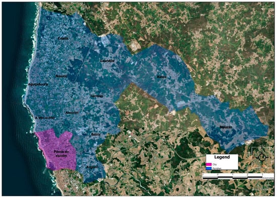 From the data, 4064 trips were selected considering the socioeconomic characteristics of the population residing in the municipality of Póvoa de Varzim and its surroundings (Figure 2). [46]. This municipality includes 7 parishes with a total of 64,320 inhabitants. The urban city center is represented in red in Figure 2. The municipality is part of the Porto metropolitan area, the second largest metropolitan area of Portugal.