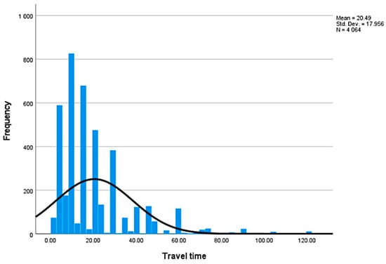 Therefore, the socioeconomic information includes gender, age, level of education, driver’s license, purpose of the trip, and mode of transportation. Gender is classified into two categories: male and female. Age is classified as follows: age equal to or less than 14 years, age between 15 and 24 years, age between 25 and 44 years, age between 45 and 64 years, and age equal to or greater than 65 years. The level of education is classified as follows: none or incomplete first cycle, complete basic education (first cycle, second cycle, or complete third cycle), complete secondary education, and complete higher education. Driver’s license is divided into two categories: has a driver’s license or does not have a driver’s license. The purpose of the trip is classified into the following categories: commuting to/from work, commuting to/from school or school-related activities, take/pick up/accompany family members or friends, leisure and sports, and purchase of goods and services. Finally, the modes of transportation are car, bus, walking, and bicycle. Table 1 lists the descriptive statistics of the selected variables, and Figure 3 presents the histogram of travel times.