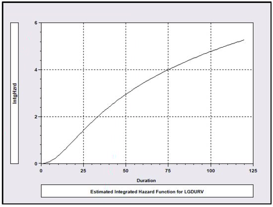 where and are the parameters to be estimated by the model. As indicated in Equation (4), if the Weibull parameter is > 1, the risk is uniform, increasing travel time; if it is < 1, the risk is uniform, decreasing travel time; and if = 1, the risk is constant regardless of travel time.