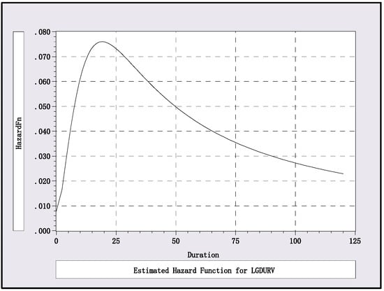 The obtained results show that the parameter P of the Weibull model with gamma heterogeneity is positive and greater than 1 (indicating a uniformly increasing function). Figure 4 shows the density function corresponding to the Weibull distribution function (the first derivative of the cumulative distribution concerning time). In addition, according to Figure 5, the risk is not constant over the duration. It can be observed that the probability of travel time (calculated between 0 and 1) being 1 min is approximately 1, while the probability of travel time being greater than 100 min is almost 0. On the other hand, the hazard function is not uniform—it increases until the travel time reaches about 15 min and then decreases (Figure 6).