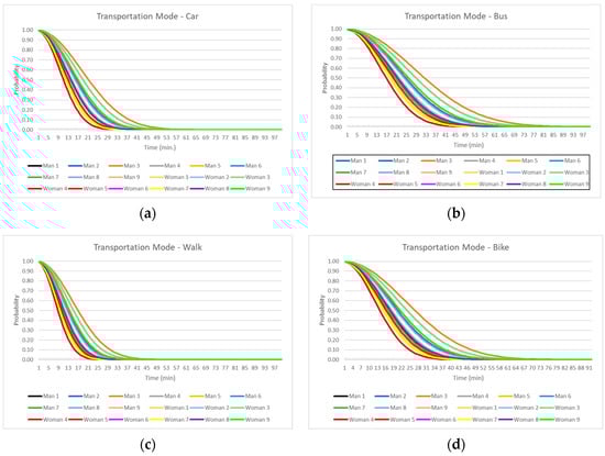 Considering the various types of users from the active population presented in Table 3, the probability of a trip ending after a certain time was analyzed based on the results obtained from the Weibull model with gamma heterogeneity. Therefore, Figure 7 depicts the variation of the probability of a trip ending over time for different modes of transportation, considering the characteristics of the selected users. Figure 7 is in line with the tendency of the survival function shown in Figure 6, as the longer the travel time, the higher the probability that it has already ended.