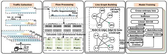 Figure 3 shows the system architecture, from which we can observe that the process of our work includes four phases: traffic collection, flow processing, line graph building, and model training.