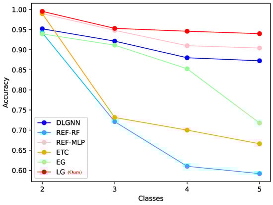 Figure 4. Model generalization on five IoV devices’ data collection. - Results: The experimental results in Table 4 show that L-GraphSAGE has a good ability to identify IoV devices in complex scenarios. Although RFE-RF was trained in , and its inference accuracy changed to 0% in and , its Recall and F1-score changed greatly. Compared with L-GraphSAGE’s training and inference results in the same environment, L-GraphSAGE’s training and inference in different environments are more stable. These experiments demonstrated that despite significant variations in the data collected by IoV in different environments and the utilization of different servers for communication, the L-GraphSAGE method can achieve better identification of IoV applications by utilizing (IP, Port) information. For other comparison models, there is no strict correlation between flows, resulting in the loss of a strong relationship between the flows. As a consequence, recognition in the real world is not as good as the method we proposed. As the number of classes increases, although the recognition accuracy of the L-GraphSAGE model decreases, it exhibits more stability than other models. Nevertheless, overfitting and underfitting occurred in this experiment. Some studies [25,26,27] require large amounts of training data to avoid overfitting and underfitting. Therefore, we increased the amount of training data from 1G pcap to 2G pcap for each IoV graph to avoid overfitting and underfitting. Moreover, we applied dropout and batch normalization during both the training and inference phases to mitigate overfitting and improve model generalization.