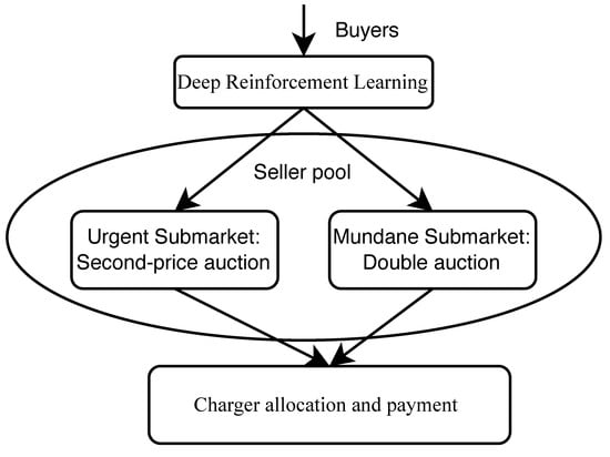 Within the coverage of FCS f, sellers are arranged into a local seller pool , where they react to incoming requests from buyers. The bids submitted by these sellers are accumulated in a designated value pool and are arranged to ensure . Concurrently, EVs engaging in the routine submarket are sorted into a buyers’ pool , where their bids are organized in , ranked such that . For the urgent submarket on the buyers’ side, a second-price auction protocol is utilized, whereas the routine submarket adopts McAfee’s method.