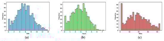 The data distribution of energy demands, charging time, and distance in the dataset. (a) Energy demands. (b) Charging time. (c) Distance.