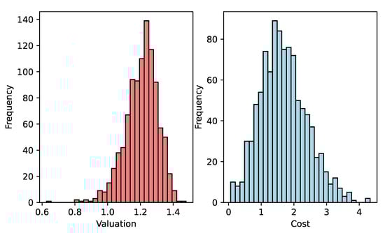 The distribution of valuations for buyers and sellers is depicted in Figure 4. The left histogram shows the distribution of valuations for buyers, ranging from approximately 0.6 to 1.4. The distribution is centered around 1.2, indicating that the most frequent valuations are close to this value. The frequency peaks at around 1.2, with the highest frequency just above 140. The distribution appears to be approximately normal, with fewer buyers having valuations significantly lower or higher than 1.2. The right histogram shows the distribution of costs for sellers, ranging from 0 to 4. The distribution is centered around 2, indicating that the most frequent costs are close to this value. The frequency peaks at around 2, with the highest frequency just above 80. The distribution appears normal, with fewer sellers having costs significantly lower or higher than 2. Overall, both distributions exhibit a bell-shaped curve, suggesting a normal distribution with a central tendency around 1.2 for buyers’ valuations and 2 for sellers’ costs.