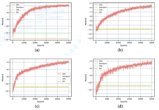 The convergence performance of the proposed MADRL-based mechanism is analyzed under different market sizes: 20, 40, 60, and 80. Figure 5 illustrates four subplots comparing the performance of the DRL-based mechanism with Random, Single Price Auction (SPA), and Double Auction (DA) mechanisms across 5000 epochs. For a market size of 20, the DRL mechanism exhibits a steady increase in rewards, initiating at approximately −11 and converging to around −7. It significantly outperforms the Random, SPA, and DA mechanisms, which display relatively static reward trends at lower levels. The Random mechanism stabilizes around −11, SPA around −10, and DA around −12. In the scenario with a market size of 40, the DRL mechanism demonstrates consistent improvement, initiating at approximately −12 and converging to around −5. It markedly surpasses the other mechanisms. Random mechanism stabilizes around −11, SPA around −9, and DA around −12. With a market size of 60, the DRL mechanism begins with an initial dip followed by a steady increase, starting from around −12 and converging to approximately −4. The reward trajectory of the DRL mechanism surpasses those of the Random, SPA, and DA mechanisms. The Random mechanism stabilizes around −11, SPA around −9, and DA around −12. For the largest tested market size of 80, the DRL mechanism displays rapid initial improvement, beginning from around −12 and converging to approximately −4 within 2500 epochs. It consistently outshines the other mechanisms throughout the training process. The Random mechanism stabilizes around −11, SPA around −9, and DA around −12. In summary, across all market sizes, the DRL-based mechanism demonstrates superior convergence performance compared to the Random, SPA, and DA mechanisms. It consistently achieves higher rewards, indicating enhanced optimization and learning efficacy. The DRL mechanism exhibits a clear upward trend, steadily improving over time and converging to higher reward levels, while the other mechanisms maintain relatively constant and lower reward levels throughout the epochs. This underscores the effectiveness of the DRL-based approach in adapting to and optimizing the dynamics of EV charging market scenarios. MADRL shows a clear upward trend, steadily improving over time and converging to higher reward levels compared to SPA and DA. The consistent increase suggests that MADRL effectively learns over time, optimizing both the buyers’ and sellers’ utilities. The rewards for MADRL start relatively low, indicating a learning curve where the system first gathers data, adjusts bidding strategies, and progressively improves its decision-making. This is expected for reinforcement learning algorithms that require sufficient exploration of actions before optimizing for rewards. Meanwhile, the rapid initial improvements for market sizes of 40 and 80 suggest that the system’s complexity and available data are more suited for larger market scenarios. This scalability is a crucial feature of MADRL, ensuring that the algorithm can perform effectively as the number of vehicles increases.