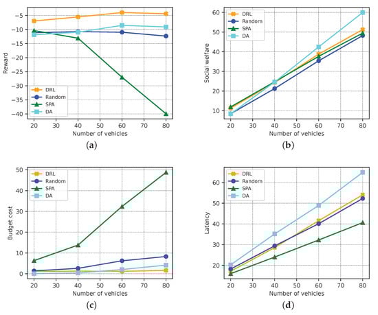 Performance comparison of the proposed learning-based mechanism under different sizes of EV charging markets. (a) Reward. (b) Social welfare. (c) Budget cost. (d) Charging latency.