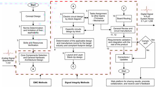 In general, electronics design is a process that demands high levels of knowledge. It requires a solid background in electronics and electromagnetic theory. It requires knowledge of the norms, standards, and regulations, and it even requires some techniques and additional knowledge that can sometimes only be acquired through experience. The more knowledge we have, the better designers we can be. The design methodology for our case study is shown in