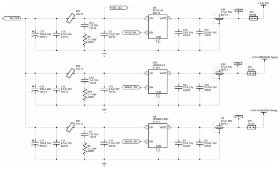 SPI Interfaces—All data acquired and/or processed by the two ADAS1000 ICs on the board is made available to the microcontroller through SPI interfaces; three SPI interfaces are required. Two are configured as slaves, and they are used to retrieve ECG data from both the master and the slave, one for each. The third SPI interface is configured as a master interface and is located on the master ADAS1000; this interface has a fixed sampling rate of 128 kHz and is used specifically for pacemaker detection. During the design process, the SPI interfaces were routed to be independent, i.e., we are not using the daisy-chain configuration common in this kind of interface. This allows data to be transmitted to the microcontroller faster while keeping the SPI clock low. This is achieved since data transmission practically occurs in parallel with the help of each peripheral’s hardware. Termination resistors were considered for the three SPI interfaces, and test points were also provided.