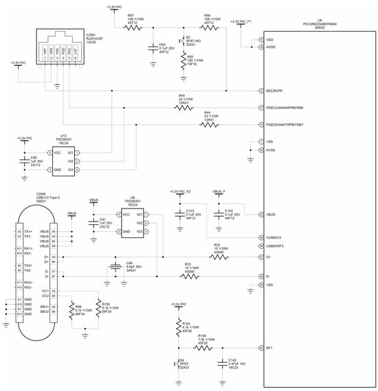 32] microcontroller from Microchip Technologies, Inc. (Chandler, AZ, USA). This microcontroller has an integrated USB 2.0 High-Speed peripheral, including the PHY layer for High-Speed. It is easy to program, the IDE (Integrated Development Environment) is provided free of charge, an evaluation board is available for its PIC family, and there are non-BGA packages available, which facilitates rework. Finally, its programmer (the PICkit™ series) is low-cost.