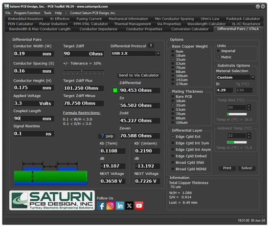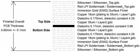 45], we know that the USB bus has to be routed with a controlled impedance of 90 ohms, in a differential-pair microstrip configuration. To meet this requirement, it is recommended to vary the trace width because, usually, a set of prefixed laminated structures is provided by PCB manufacturers at standard cost. Custom laminated structures are available at a higher cost, but using the most cost-effective option is preferred. The multilayer laminated structure we use for our electrocardiograph is illustrated in