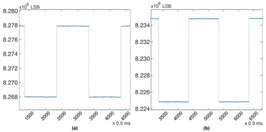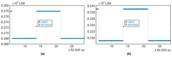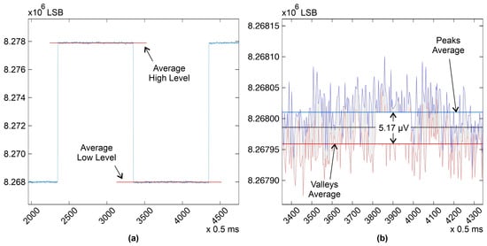 Calculating the LSBs between the red line and the blue line and multiplying this number by the system resolution calculated in Step 3 resulted in system noise of 5.17 μV, which is indeed below 30 μV; therefore, our signal complies with this requirement as well.