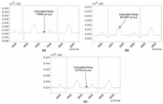3, we obtained the ADC resolution of 0.100918059 μV. This is our system’s resolution, which is below the limit of 5 μV set by the IEC 60601-2-25; therefore, our signal meets the requirement. The ADC readings and the number of LSBs are completely dependent on the format and resolution of the analog-to-digital converter being used. The ADAS1000, sampling at 2 kHz, uses a 19-bit resolution ADC, left-justified in a 24-bit data word [