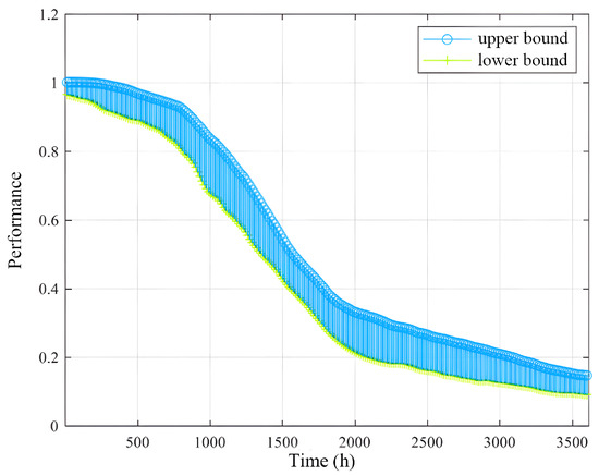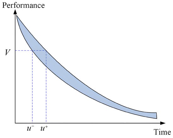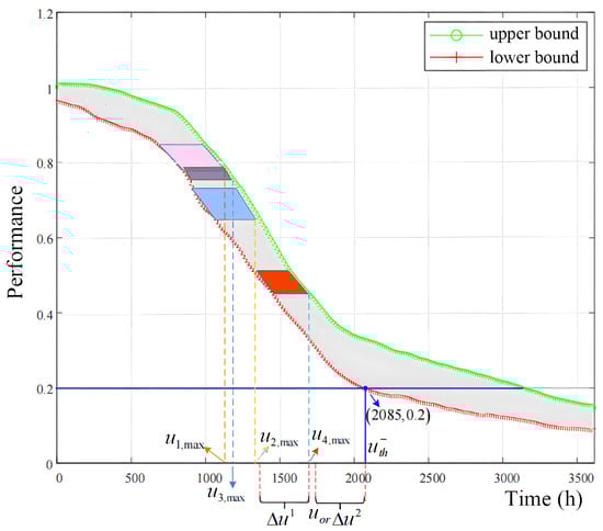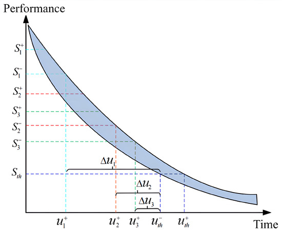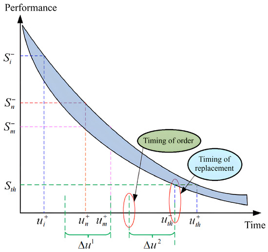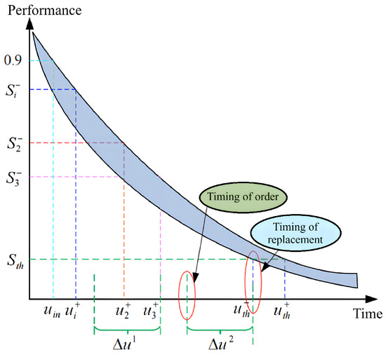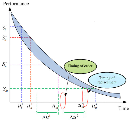 - Determine the spare parts replacement threshold and timing: Once the performance degradation envelope has been obtained, the next step is to define the replacement criteria. This is obtained by setting the spare parts replacement threshold , which indicates the minimum acceptable performance level before a replacement is necessary. Additionally, the replacement timing must be determined, which indicates the optimal time for replacing the spare parts to avoid failure or excessive wear. These thresholds and timings are established based on expert experience, historical data, and the working mechanism of the running gears.