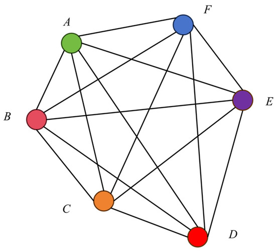 Step 4: Use the constructed graph G as the problem space for the ant colony algorithm to mine association rules, as shown in Figure 2. A to F in the figure represent vertices.