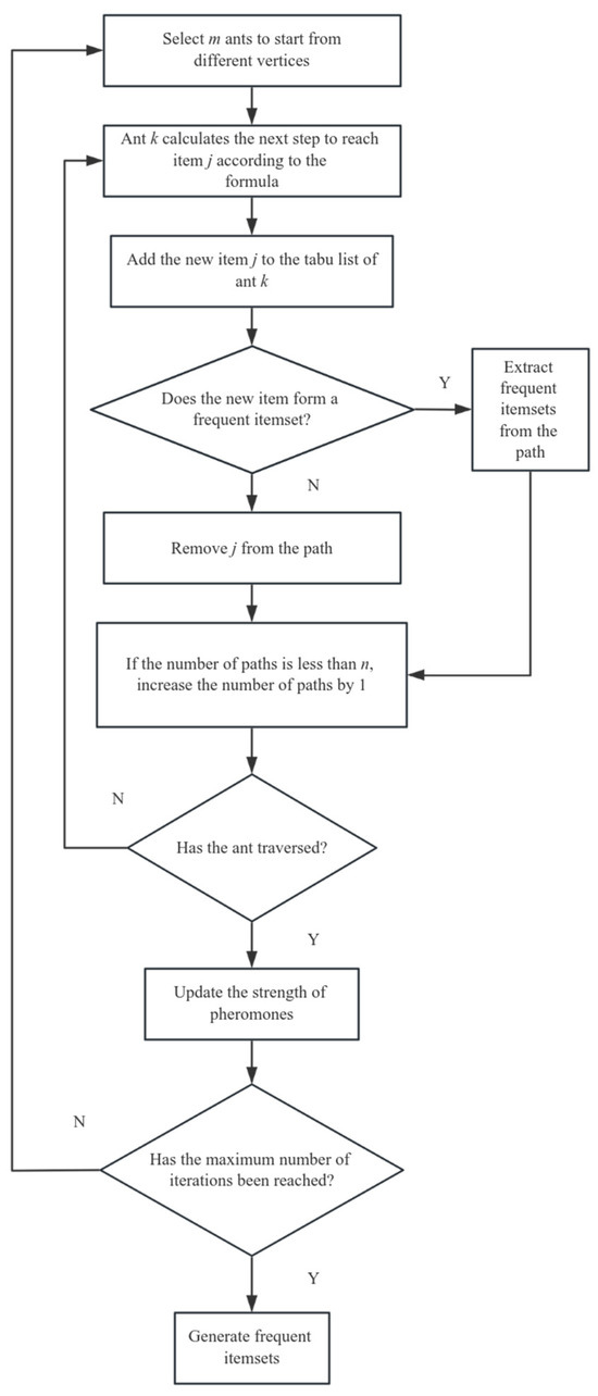Next, an undirected graph with all frequent items in the database as locations is established, which represents the problem space for the ant colony algorithm. An ant traversing the graph once to find the optimal path is equivalent to finding the frequent itemset with the highest support. The steps include the following:
