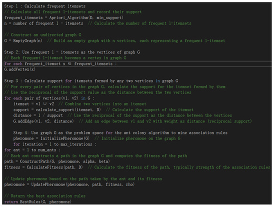 Association rules can help uncover hidden relationships within data. We must rely on algorithms to automate mining these rules from large datasets effectively. In this regard, the AA plays a crucial role [28,29,30,31,32]. A classic association rule learning algorithm uses an iterative approach to generate frequent itemsets and then extracts applicable association rules from them. Its fundamental idea is to reduce the search space for computing frequent itemsets through joining and pruning.