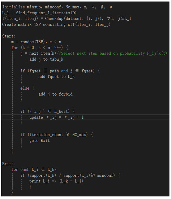 where represents the pheromone concentration on the path from point i to point j at time t. The value of on each path is within the range , and the initial value is set as . represents the heuristic value from point i to point j, which equals the reciprocal of the support value between the two vertices. and represent the influence of pheromone and heuristic information on the ant’s decision, respectively. represents the next city that ant k can choose.