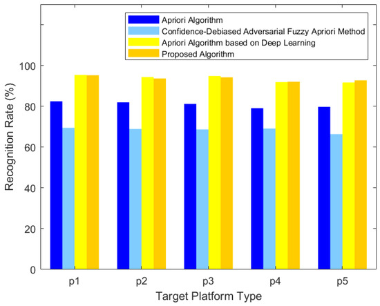First, 100 sets of 1200 sets of detection data were randomly generated based on the performance of each of the 12 selected detection platforms. The BV threshold was set to 1, and the minimum support was set to 0.6. The ant colony algorithm had 60 ants, one pheromone importance, two heuristic pheromone importance, 0.1 pheromone fluctuation, and 100 iterations. Then, data mining methods were used to establish recognition association rules for each detection platform based on signal feature types, selecting five association rules with the highest confidence for each section, for a total of 60 rules. Finally, the proposed algorithm was compared with the three algorithms proposed in the previous section, and the results are shown in Table 20 and Table 21. The most standard answer is the radar raw data type, and the accuracy is the radar type correctly identified by the algorithm.