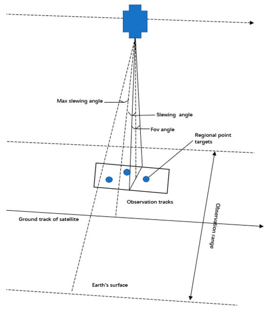 Agile satellites operate in the orbit of the earth at a high speed compared to traditional optical satellites; agile satellites rely on sensitive attitude control systems to achieve yaw and obtain image information within a certain area near the ground track of the satellite. A schematic diagram of the angle range for agile satellite attitude observation is shown in Figure 1.