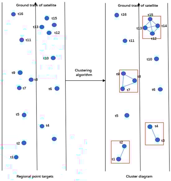 Task clustering reduces the number of satellite observation ground tasks, as shown in Figure 2. The blue areas represent observable point targets, and the red rectangles represent point targets clustered after satisfying certain clustering conditions. Clustering point targets that satisfy specific clustering conditions can reduce the number of satellite attitude maneuvers and imaging times, thus completing observation tasks more efficiently.