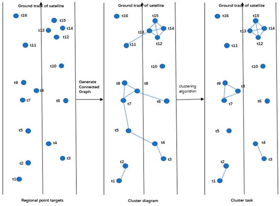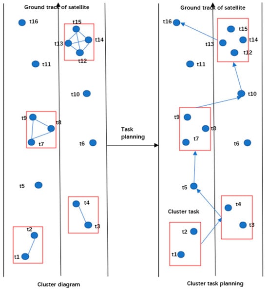 When a large number of target points exist, multiple on/off operations and attitude maneuvers are required to meet the observation conditions. In addition, there are mutually exclusive situations among tasks [2]. For example, there may be a conflict in the observation time between two tasks, or the time interval between tasks may be too short to complete attitude conversion, which results in some targets being unobservable. Traditional observation methods are characterized by low observation efficiency and high energy consumption. Clustering tasks that meet certain conditions enable multiple tasks to be completed in one observation, reduce the number of on/off operations and imaging satellite attitude maneuvers, and thus complete observation tasks more efficiently [3]. Kim [4] established a cluster partitioning model for single-star scheduling problems and provided relevant solving algorithms. Wang established a task-merging graph model [5] and proposed a task-merging algorithm based on clique partitioning (CPTM). Reference [6] proposed a dynamic clustering strategy and adopted an adaptive simulated annealing scheduling algorithm in the subsequent task scheduling stage to achieve the interaction between clustering and scheduling. Reference [7] divided the multi-point observation problem into two stages. Firstly, the minimum cluster partitioning algorithm was used to cluster the targets that meet the field of view constraints. Then, a directed acyclic graph model was established, and an improved ant colony algorithm was used to generate the optimal path. Reference [8] studied the emergency task clustering and planning problem of AEOS. Yanbin Zhao [9] clustered the densely distributed point targets according to their distance and direction and used the Tabu algorithm to generate local observation paths, significantly reducing the planning time while ensuring optimal solution quality. Yanjie Song [10] utilized the k-means clustering method and proposed a clustering-based genetic algorithm to solve the satellite ranging scheduling problem. By combining clustering with a genetic algorithm, the adaptability of the algorithm was improved. Yixin Huang [11] proposed an improved graph-based minimum clustering algorithm. This algorithm takes task priority and the observation yaw angle under constraint conditions into consideration and uses the processed clustering tasks as inputs for subsequent algorithms.