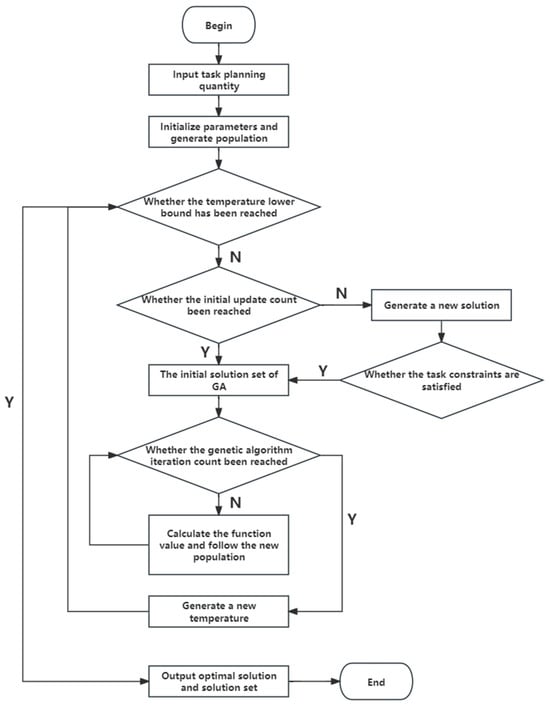 Firstly, a certain number of population individuals are randomly generated. Then, within the number of iterations, a feasible individual is randomly selected for optimization operations to determine whether the new solution is superior to the optimal solution. If it is superior to the original solution, the new solution is retained to replace the original solution in the population, and the solution follows. After a certain number of updates, the new population is used as the initial solution of the genetic algorithm. After selection, crossover, and mutation, individuals with better fitness are selected for population updates to complete an SA (simulated annealing) iteration for optimization until the temperature drops to the set lower temperature bound.