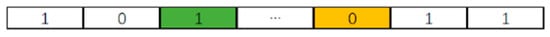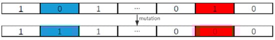 Mutation can enhance the algorithm’s search ability within the feasible domain. This paper adopts binary mutation. It traverses the individuals in the population one by one and judges whether each individual in the population will mutate according to the preset mutation probability. If an individual mutates, two positions are randomly generated on the individual, and the gene value is inverted at the generated positions. The mutation operation is shown in Figure 8.