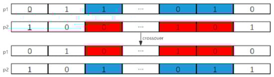 Crossover operation is a necessary operation in genetic algorithms. It can enhance the search range of feasible solutions and help the population break away from the local optimal solution. In this paper, the chosen crossover operation involves iterating through individuals in the population based on the crossover probability and determining whether to select the current individual. For selected individuals, another individual from the population is randomly chosen for the crossover operation. Two gene positions on the parent individuals are then randomly selected, and the genes in these positions are exchanged. The crossover operation is shown in Figure 7.