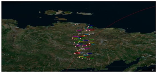 This section conducts simulation verification on the task clustering algorithm and task planning algorithm proposed in this article. The range (latitude 62–72°, longitude 145–150°) generates a uniform distribution of 20,50 dense area point targets. The observation angle of the satellite to the target area of the meta-mission is calculated by the STK 11.60. The simulation time is in the period of 00:00:00 1 February 2024–00:00:00 2 February 2024. The sensor field of view is 10 degrees, the maximum start-up time is 150 s, and the maximum yaw angle is 45 degrees; if two tasks can cluster, the time window interval Δt is 5 s. The parameters of the satellite sensor are shown in Table 2.