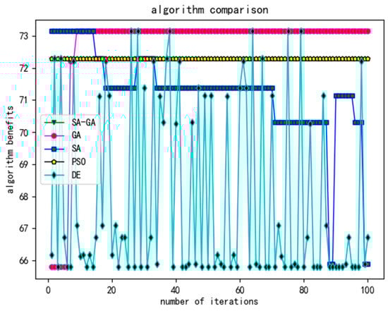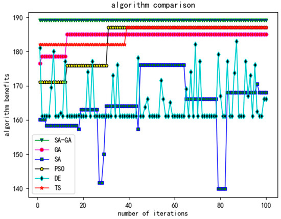 The results shown in Figure 10 were obtained by randomly selecting 100 iterations of the SA (simulated annealing algorithm) and the SA-GA (Simulated Genetic Annealing Algorithm), representing the relationship between the algorithm returns obtained in the process of 100 iterations during the operation of an algorithm. As can be seen from the graph, the SA-GA (Simulated Genetic Annealing Algorithm) is the most stable and approaches the optimal solution faster than other algorithms.
