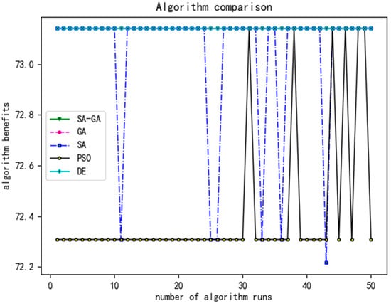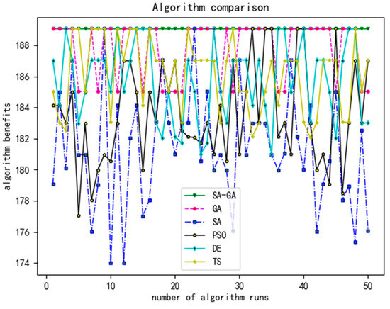 The comparison of algorithm benefits after 50 runs of the algorithm is shown in Figure 11, and it can be seen that the experimental results obtained by the SA-GA (Simulated Genetic Annealing Algorithm) are more stable than those obtained by other algorithms after 50 algorithm runs, but the algorithm benefits obtained by the SA-GA (Simulated Genetic Annealing Algorithm) are not significantly better than those of other algorithms, which may be due to the small data range of the experimental data.