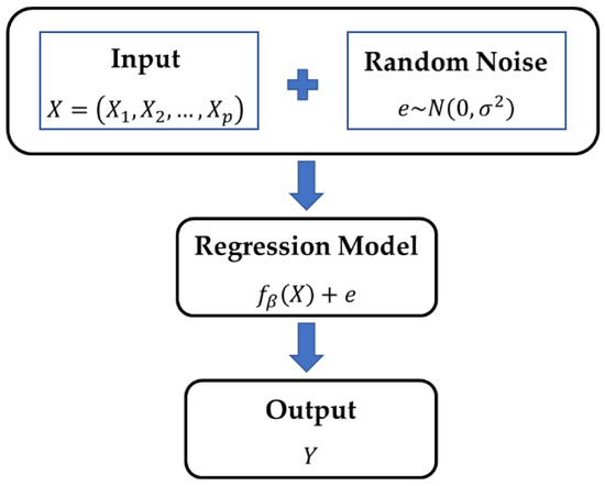 The regression model is very popular in machine learning as well as in statistics [12,22,23,24]. This model consists of independent and dependent variables called X and Y, respectively [22]. Regression analysis is statistical modeling that explores relationships between variables [24]. We can predict Y for a given X using regression analysis [19]. Figure 1 shows a process of regression modeling [23].
