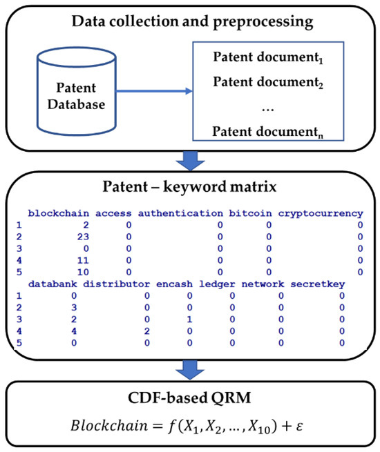 In this paper, the proposed model was used to finally select technology keywords that have a statistically significant impact on blockchain technology. We had difficulty identifying technological relationships between patent keywords using our proposed model. However, understanding the interrelationship structure between the sub-technologies required for blockchain technology development is an important task in understanding this technology. This part represents the limitations of our study. To overcome the limitation of our proposed model, we considered social network analysis (SNA) and Bayesian learning. In our future works, we apply SNA to our CDF-based QRM to make a technology diagram representing the technological relations between the patent technology keywords. In addition, we will apply Bayesian learning to the CDF-based QRM. We call this Bayesian learning for QRM. In this model, we assume the prior distributions for the parameters of the QRM model. This learning model updates the model parameters using the given data. That is, we will be able to improve the QRM performance of explanatory and predictive power using the Bayesian learning process whenever new data are added. The prior distribution of the parameters is updated by combining it with the likelihood function of newly observed data to form the posterior distribution of the parameters. That is, the parameters become random variables with probability distribution functions rather than fixed values and can be effectively used in the analysis of a zero-inflated patent–keyword matrix. Our research is expected to contribute to various fields by improving understanding of technology and finding relationships between detailed technologies through our PKA.