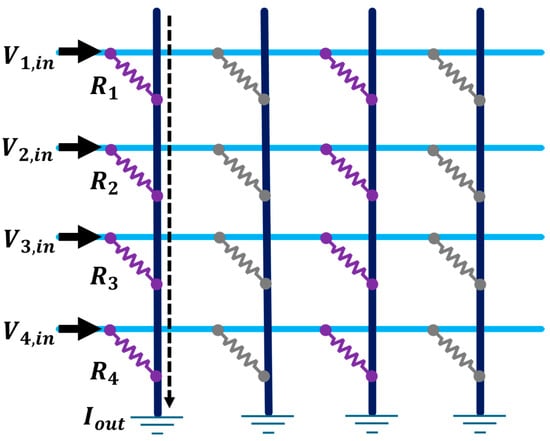 The current traversing each memristor can be modulated by altering the voltages across the rows or columns because memristor terminals have array rows and columns. Within the crossbar array, Ohm’s Law is utilized to determine the current flowing through each memristor. The conductance () of these memristors is carefully adjusted to emulate synaptic weights within the neural network. When the input signal is applied to the cross array, the conductance of each memristor is proportional to the current passing through it. By measuring the current in each column, the result of the input vector and weight matrix can be obtained. The sum of these currents, that is, the current at each output node (according to Kirchhoff Law, which is expressed in Equation (1)) represents the output of the network [26].