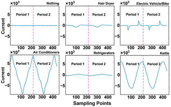 The currents of various household appliances, including air conditioners, refrigerators, hair dryers, kettles, and electric vehicle/bikes were collected. Due to the hazardous nature of electric vehicle/bike charging inside the household, we regard all electric vehicle/bike charging as an abnormal condition in·this·paper. Figure 3 shows the currents of different electrical equipment passing through the CB in two cycles. It is notable that the unique features could be observed within one cycle (220 sampling points). In the paper, current signals were selected for the experiments because they exhibit more pronounced characteristics across different devices. There are in total 11,497 signal data in our dataset (the training data: 9198; the testing data: 2299). Finally, 250 data were used to test in the hardware.