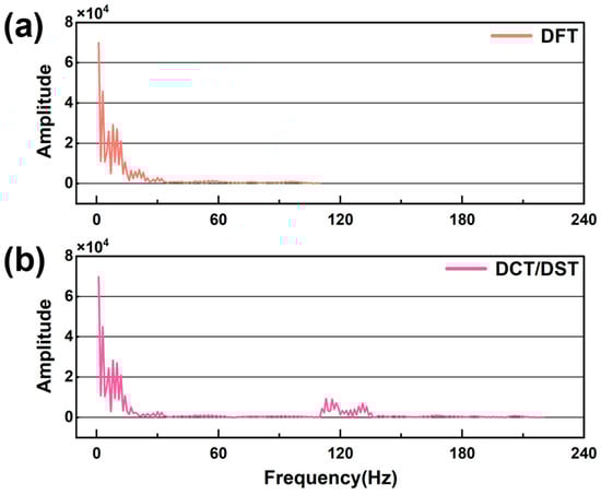Figure 5a,b shows the results of DFT and DCT/DST, respectively. Equations (2)–(4) show the corresponding formula. The result from DCT/DST has more data-points than the DFT magnitude because DCT/DST combines magnitude and phase information: