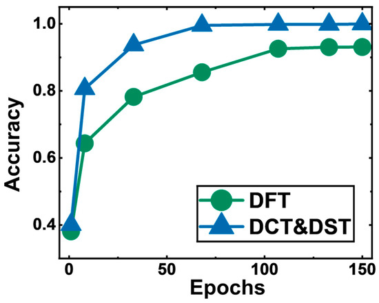 As shown in Figure 6, the curves represent the accuracy rate on the training set during NN training. This accuracy refers to the whole classifications’ average accuracy. Obviously, the accuracy of DCT/DST (99.3%) is superior to that of DFT (93.1%). The model accuracy on the test set is the same as that on the training set.