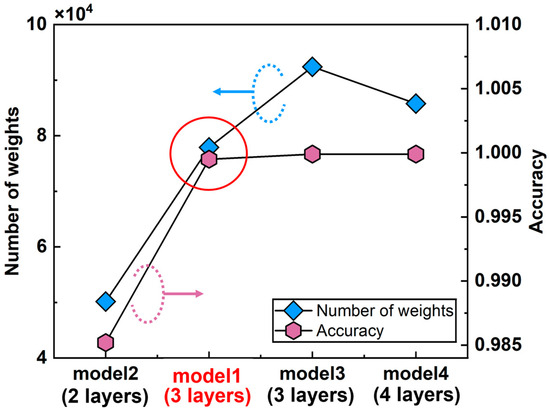 The smaller and larger NN were also tried as shown in Figure 7. The smaller model (model-2, with one layer less than model-1) shows obviously lower accuracy. However, the benefits of the larger hidden-layer model (model-3, with 1.5 times the number of the hidden layer neuron of model-1) and the deeper model (model-4, with one layer more than model-1) on the accuracy is almost negligible. The above discussd model-1 is a good compromise of accuracy and computing consumption for the current dataset. It should be noted that, in more complicated tasks with more types of devices to be classified, a larger scale NN might be needed.