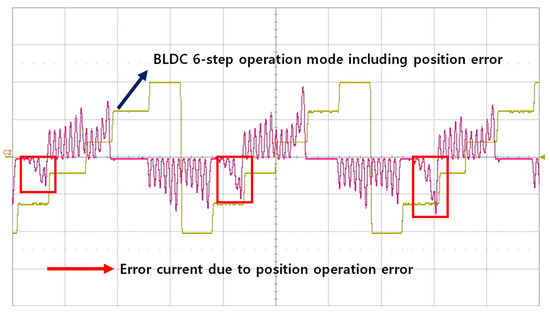 Recently, some handpiece motors have adopted sensorless control techniques to drive the motor by tracking the position of the rotor without using magnetic sensors, aiming to reduce costs and simplify the structure [6,7]. However, micro-motors generally use thin coils as stator windings, and the number of coil turns per stator slot is large, which means they can generate significant heat even with a small current. In the sensorless position control technique based on the parameters of the motor operation area, when a position error occurs due to low accuracy parameters or an external load condition, the input current fluctuates and acts as a load, as shown in Figure 2. The current generated by this error has the disadvantage of generating more heat, as shown in (1), where represents the amount of energy generated due to temperature changes, denotes erroneously commutating current, and is the resistance of the stator coil in the motor.