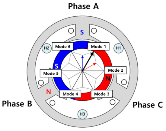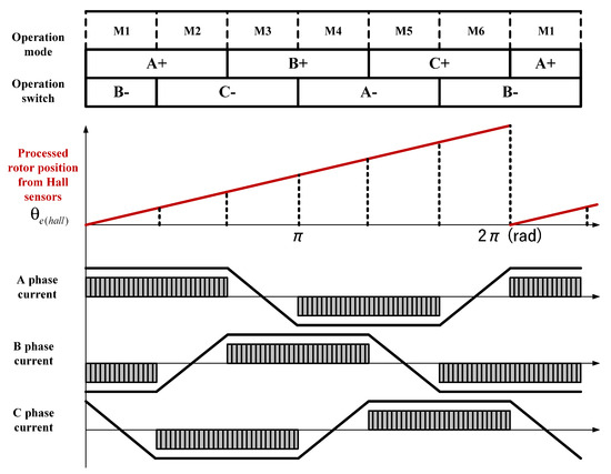In addition, the general six-step control of a BLDC motor generates rotational force by operating in six modes of two-phase switching commutation using a Hall sensor, as shown in Figure 1a and Figure 4. The low-cost Hall sensor of a two-pole handpiece motor provides low-resolution position information, and the six-step control, which generates six operating modes per rotation of the motor, is not suitable for maintaining constant speed and torque output in the low-speed operation range. The six-step control results in non-linear motor operation and increased harmonic distortion, which can lead to poor precision in position and speed control at low speeds, as well as increased torque ripple [8,9]. Therefore, in systems where precise and constant control performance is crucial, more accurate control methods like Field-Oriented Control (FOC) are applied.