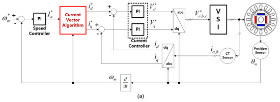 Block diagrams for constant speed and torque control using the vector control method: (a) speed control; (b) current control for maintaining constant torque.