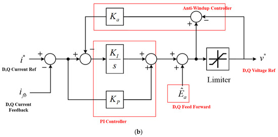 Therefore, the position information must be transitioned after eliminating the position error that occurs between the actual synchronous coordinate system and the generated coordinate system from the MCU . The current reference for the motor, incorporating the generated position signal from (7), can be determined as shown in (8). Generally, the output torque of a permanent magnet synchronous motor is determined by the -axis current, the -axis current in the synchronous coordinate system, and the motor parameters, as given in (9). In addition, the - and -axis currents , derived from generated position information with position errors, are transformed in the synchronous reference frame, as described in (10). Therefore, the output torque equation is expressed as (11) using the generated rotor position information.