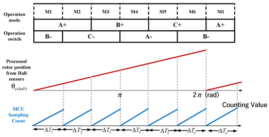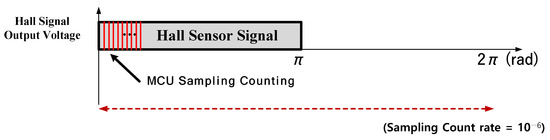 Figure 7 represents the method for converting the binary position signals (0 and 1) from a digital Hall sensor installed to the motor into precise position information, using an MCU with a 10 kHz processing speed. The signal from the digital Hall sensor can be sampled over one electric angle period of to derive the time difference using (5).