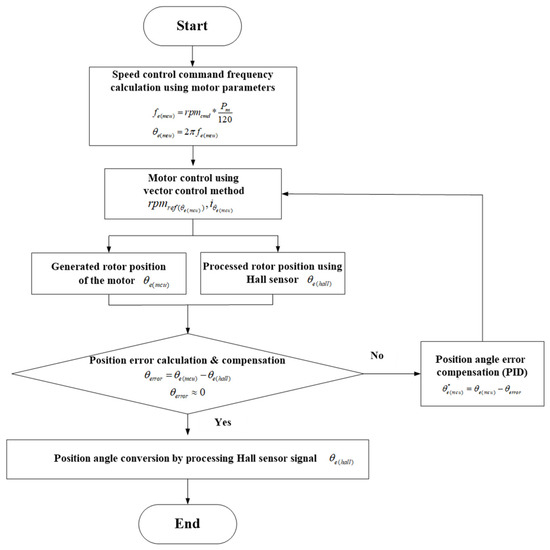 Figure 8 illustrates the flow chart of the transition method for the rotor position signal at a certain high speed, where stable sampling of the Hall sensor is achieved, after driving the motor with forced synchronization at low speeds using (4). First, in the low-speed, high-torque range, stable speed control is performed through vector control based on the obtained from (3) and (4). Next, at speeds where stable sampling of the Hall sensor occurs, the corrected Hall sensor angle is calculated using (5) and (6). Simultaneously, to synchronize the MCU and Hall sensor angles, the angle error is computed using (7). Finally, once the desired speed transition range is reached and the speed transition begins, the position angle error compensation algorithm, based on PID control, is quickly processed to minimize the position angle error (, which allows the motor to operate based on the Hall sensor angle signal.