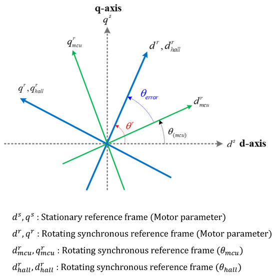Figure 9 illustrates the relationship between the stationary coordinate system ; the synchronous coordinate system based on the Hall sensor; and the current coordinate system using the generated position information from the MCU. The coordinate system , based on the information from the Hall sensor attached to the motor, is identical to the rotor’s rotational coordinate system .