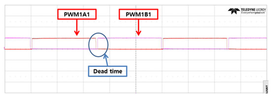 As described previously, speed and current control using the position data generated by the MCU and Hall sensors employs vector control, a three-phase PWM method. Figure 10 shows that in a PWM inverter, dead time is implemented to prevent short circuits of DC link (i.e., arm short) and potential damage to the switching devices caused by simultaneous conduction of two switches in the same phase. By applying a short dead time between on/off switching operations of each phase, both switches within the same phase are turned off during this interval. In three-phase vector control with the dead time, a current controller can be implemented to maintain a constant torque. For the low-speed control algorithm applied in this study, a dead time of 1 µs was applied, considering a stable margin.