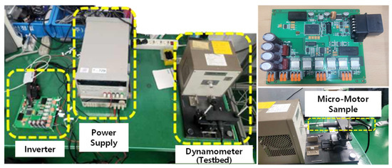 To validate the proposed algorithm for expanding the speed operation range of the micro-motor, the experimental configuration was implemented as shown in Figure 16. The inverter specifications for driving the micro-motor involved using the TI TMS320F28335 MCU for sampling Hall sensor position signals and generating position data. The Micro Commercial MCU20N10-TP (100V, 20A) was used for the three-phase inverter’s power MOS-FET, and the ACS725LLCTR-20AB was used for the three-phase current sensors, with sufficient margin to tolerate potential spike components during inverter switching. Additionally, auxiliary circuits, including filter circuits for noise reduction and communication circuits for motor drive, were implemented for the experimental setup.